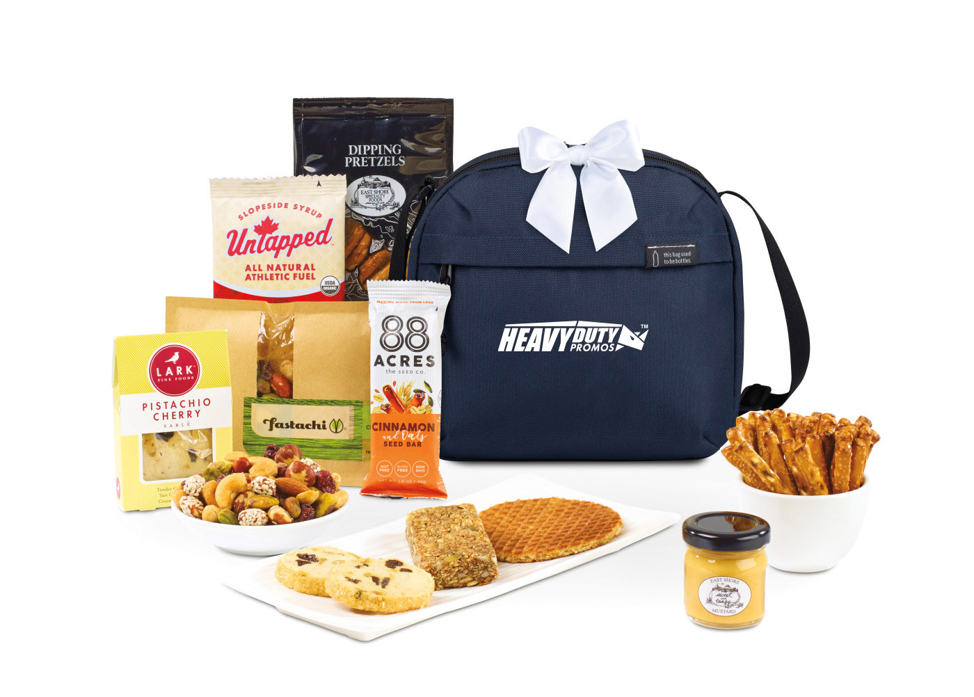 - INCLUDES: Lark Pistachio & Cherry Shortbread Cookies 1.2 oz, East Shore Specialty Foods Dipping Pretzels 2.0 oz, and Tangy Mustard 1.4 oz, Fastachi Nut Mix 3 oz, 88 Acres Cinnamon Oat Seed Bar 1.6 oz, Untapped Maple Energy Waffle 1.1 oz
